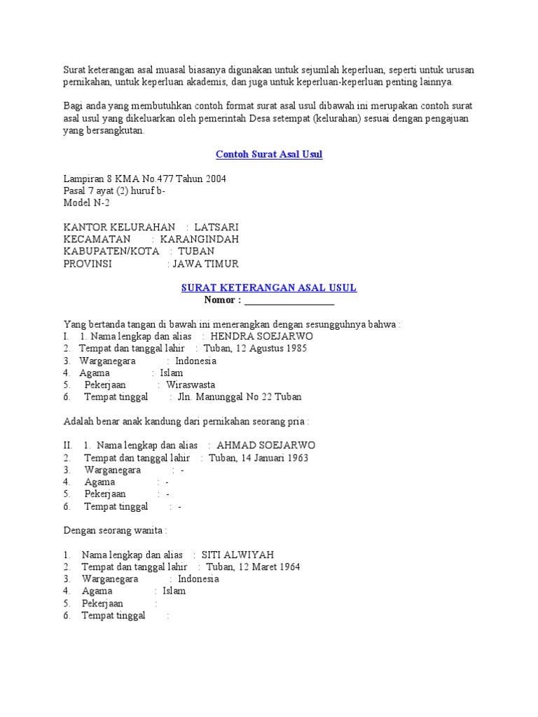 Contoh Surat Keterangan Asal Usul