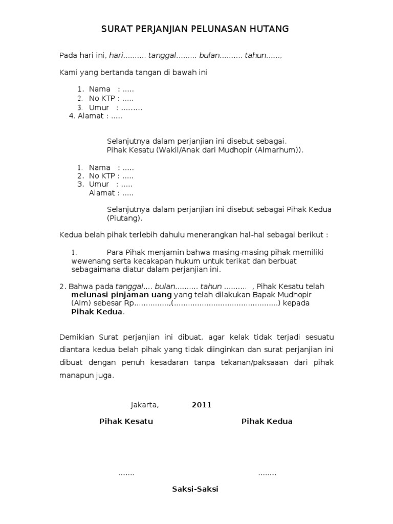 Contoh surat pernyataan pelunasan hutang format resmi. Contoh surat kesepakatan bersama dalam hutang piutang.