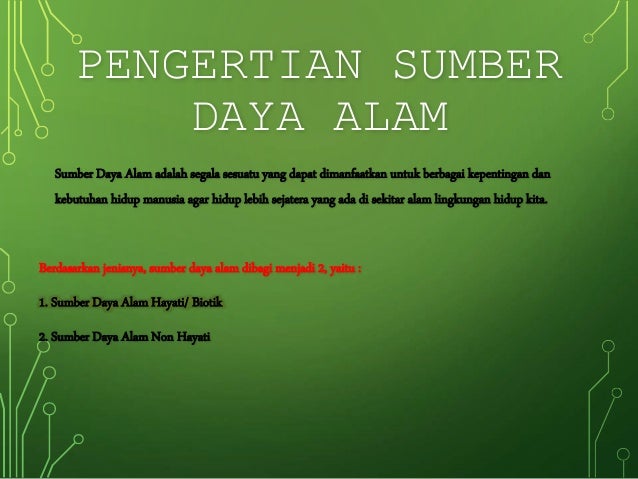 Sumber daya alam atau sda dapat diklasifikasikan dalam dua kelompok berdasarkan jenisnya yaitu sumber daya alam hayati sumber daya alam biotik dan sumber daya alam non hayatisumber daya alam non hayati dikenal juga dengan istilah sumber daya alam abiotikfrase non hayati dapat diartikan tak hidup. Contoh sumber daya alam non hayati yang sangat vital adalah minyak bumi dan batubara. Sumber daya alam nonhayati dapat habis atau tidak dapat diperbaharui lagi.