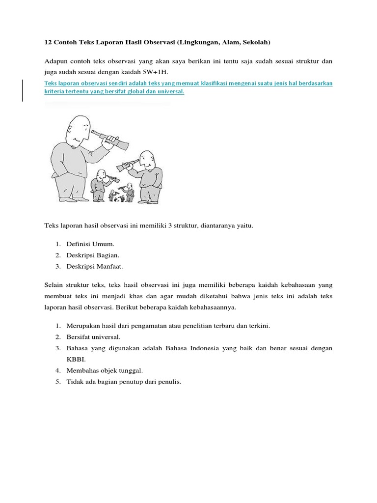 Teks laporan hasil observasi hampir menyerupai teks. Agar kamu semakin paham berikut ini admin rangkumkan beberapa contoh teks laporan hasil observasi yang sudah sesuai dengan kaidah 5wh1. Struktur dan ciri ciri dari teks hasil laporan observasi.