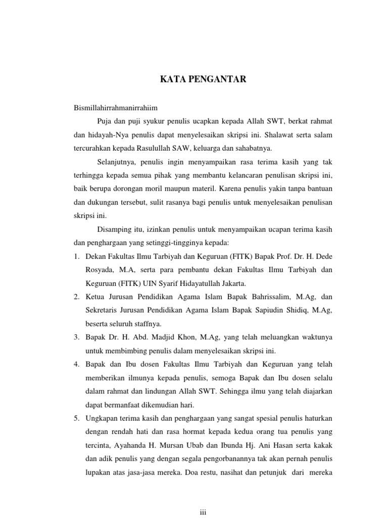Pada dasarnya kata pengantar itu berisi ucapan terima kasih dan penghargaan yang ditujukan kepada pihak terkait yang telah turut serta membantu dalam penyusunan usulanproposal penelitian maupun skripsi tesis disertasi. Lazimnya sebuah proposal karya ilmiah seperti skripsi tesis dan disertasi biasa cukup disebut dengan proposal penelitian. Kata pengantar segala puji dan syukur penulis panjatkan kehadirat allah swt karena atas berkat rahmat dan ridho nya tesis ini dapat disusun dan diselesaikan.