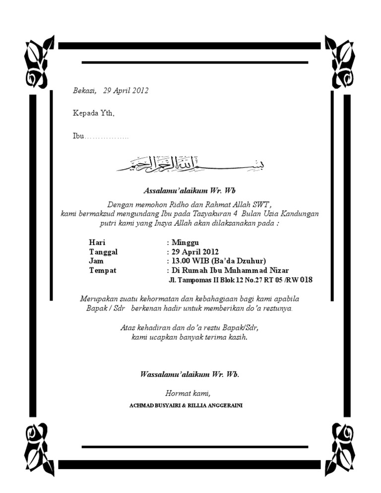 Contoh surat undangan syukuran 4 bulanan posted on oktober 23 2014 by bodytypesc97jxf. Contoh undangan syukuran 4 bulanan kehamilan hukum syukuran 7 bulan kehamilan boleh atau tidak. Perlu diingat dalam pembuatan surat undangan harus lengkap supaya pihak yang diundang paham dan merasa penting untuk hadiri.