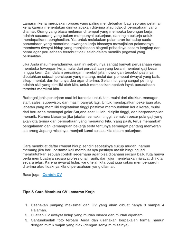 Sebenarnya tidak sulit untuk membuat daftar riwayat hidup untuk melamar pekerjaan jika tahu unsur unsur yang harus dimasukkan kedalamnya. Contoh daftar riwayat hidup cv lamaran kerja sebelum saya paparkan artikel tentang contoh daftar riwayat hidup terlebih dahulu penting untuk anda ketahui yaitu cara membuat surat lamaran kerja lihat contoh surat lamaran kerja. Banyak contoh cv yang beredar di internet.