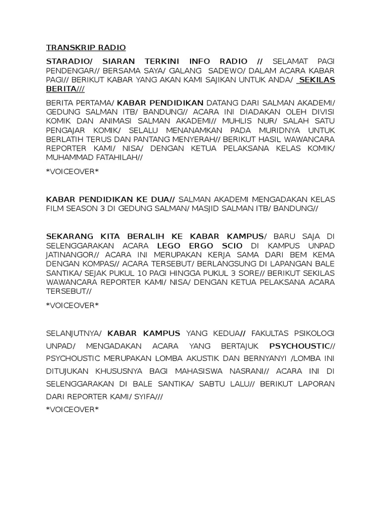Berikut ini contoh naskah script siaran berita radio lengkap dengan opening pembukaan siarannya. Contoh naskah siaran radio naskah radio about.