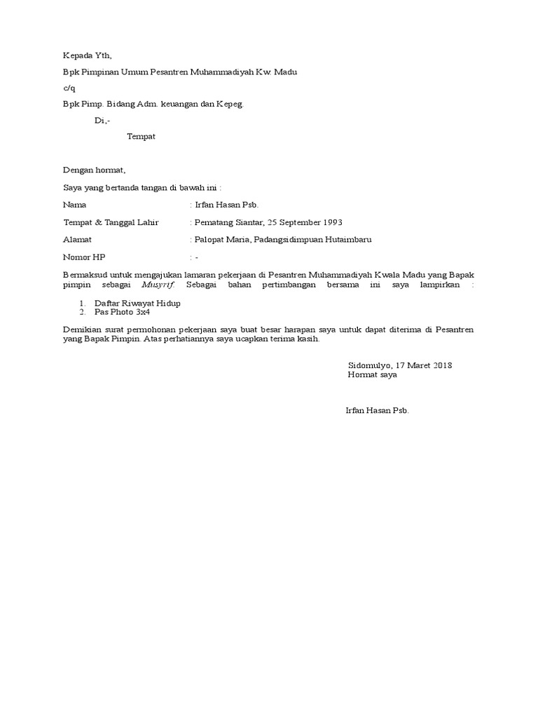 Contoh Surat Lamaran Kerja Yang Benar Menurut Hrd Doc Guelagi
