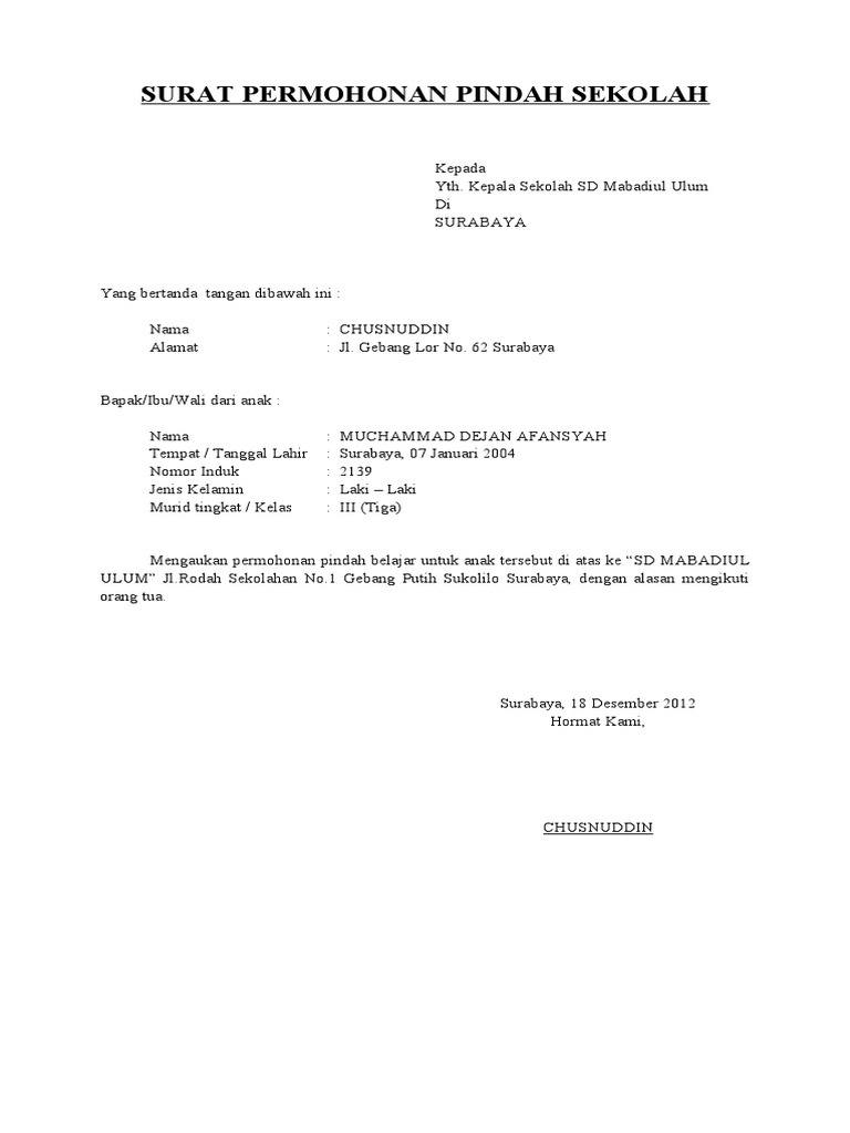Contoh surat permohonan pindah sekolah sebelum kita ke pokok bahasan hari ini saya akan mengingatkan kembali tentang apa yang telah saya bagikan sebelumnya. Contoh surat permohonan pindah sekolah. Surat permohonan pindah sekolah merupakan sebuah surat yang dibuat oleh orangtua wali atau siswa untuk memohon kepada pihak sekolah asal agar bersedia memberikan izin atas kepindahan siswa tersebut ke sekolah lain.