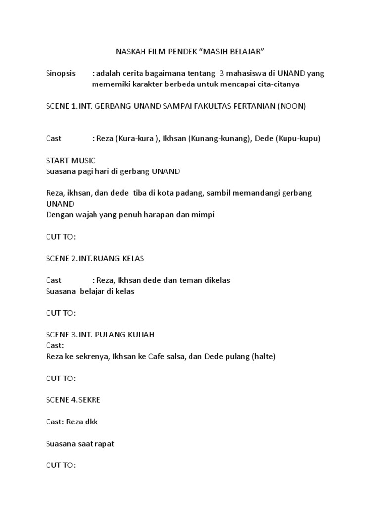 Saya akan menunjukkan skenario film pendek yang berjudul bolpoint. Sinopsis film pendek sekolah ku andi adalah seorang anak yang hidup di sebuah desa yang masih asri. Andhika contoh text pembawa acara mc pada acara ulang tahun sekolah.