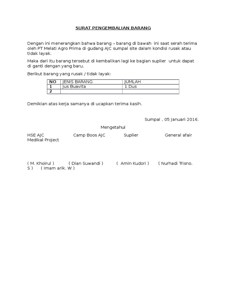 Contoh surat retur barang. Contoh surat retur pengembalian barang. Dari pt kerang hijau cilacap selaku pihak distributor produk tempe bermaksud menginformasikan kepada bpkibu mengenai retur khususnya produk forisa. Bersama ini pula kami lampirkan faktur pembelian barang tersebut untuk lebih mempermudah penyelesaian persoalan tersebut.