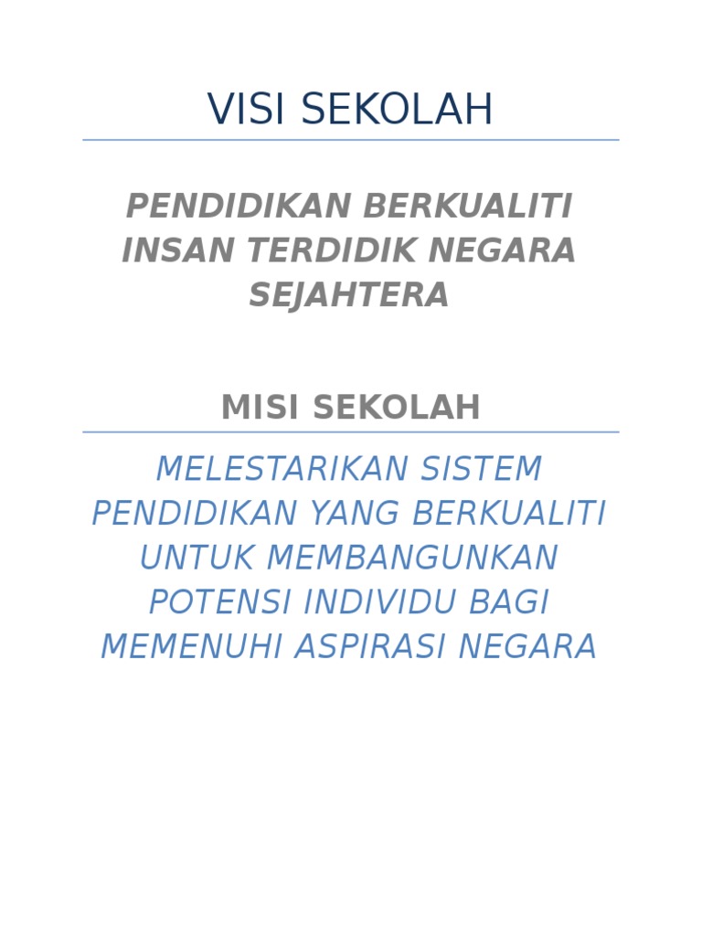 Contoh visi misi sekolah. Pendidikan berkualiti insan terdidik negara sejahtera. Kegiatan ektrakurikuler kegiatan ekstrakurikuler adalah kegiatan pendidikan di luar mata pelajaran dan pelayanan konseling untuk membantu pengembangan peserta didik sesuai dengan kebutuhan potensi bakat dan minat mereka melalui kegiatan yang secara khusus diselenggarakan oleh pendidik dan atau tenaga kependidikan yang berkemampuan dan berkewenangan di sekolah. Sekolah skm b tiada perjawatan kecuali gpk hem dg29 sambung belajar ijazah gpk diberi dg41kup 3.
