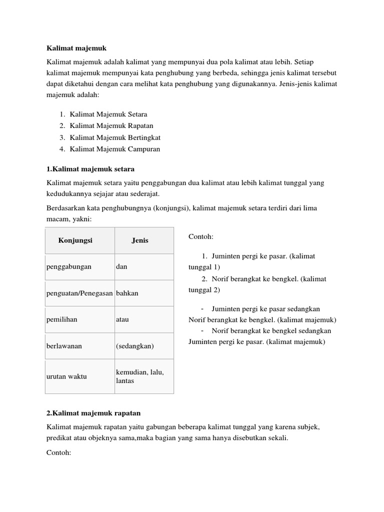 Di dalamnya teman teman bisa menemukan dua buah konjungsi atau lebih yang sifatnya menjadi kata hubung koordinatif maupun bukan. Ada beberapa jenis kalimat yang harus kemu ketehui dari kalimat majemuk antara lain kalimat majemuk setara ratapan bertingkat perluasan campuran.