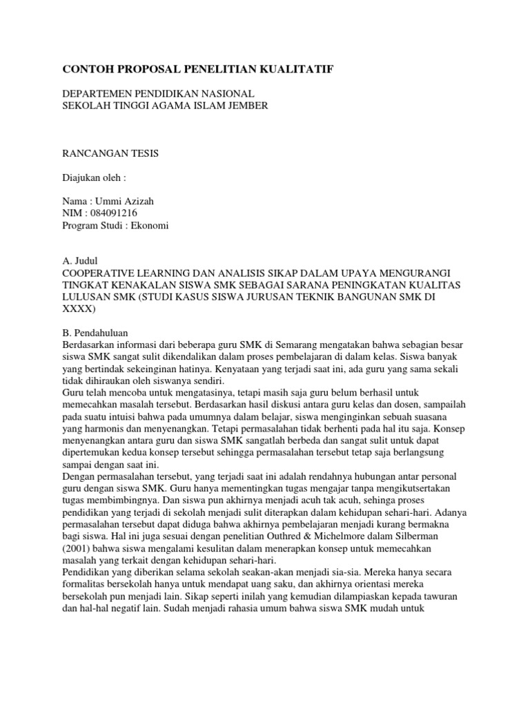 Sebab dalam penelitian kualitatif memang selalu ada alternatif penjelasan yang lain. Contoh proposal kualitatif. Contoh proposal penelitian pendidikan.
