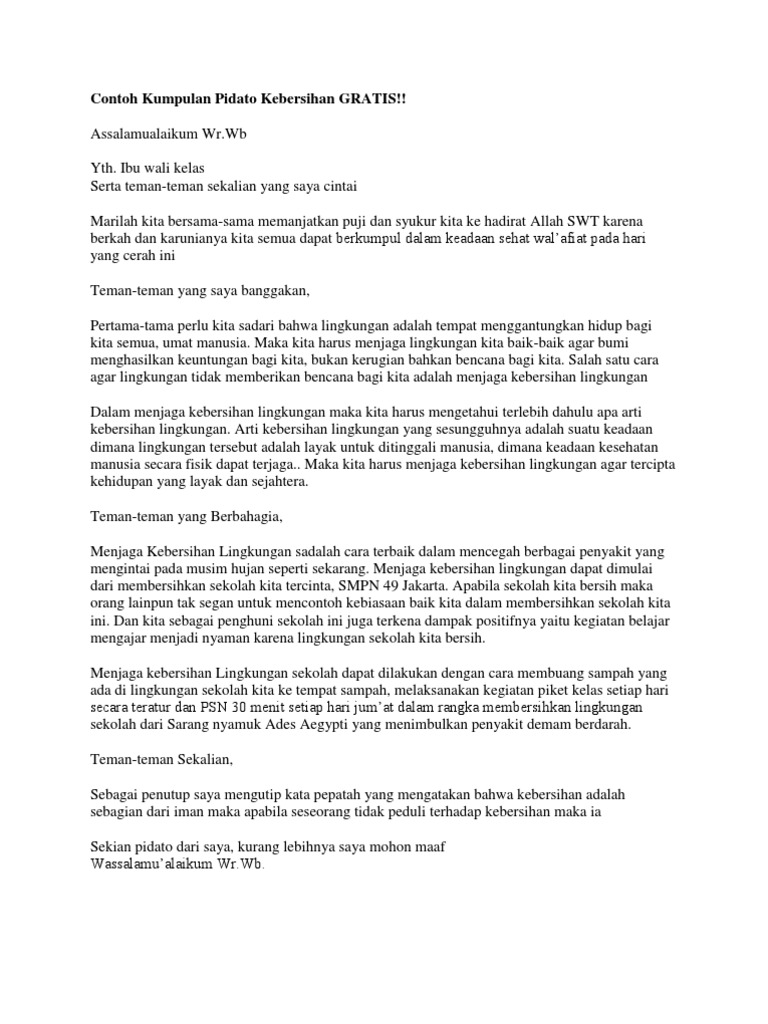 Berdasarkan isi yang disampaikan pidato terdiri atas berbagai macam diantaranya ialah pidato kenegaraan pidato politik pidato orasi pidato tentang pendidikan dan lain sebagainya. Pidato kebersihan lingkungan sekolah mencintai kebersihan adalah sebagian dari iman tentunya sahabat juga sudah sangat mengerti bukan. Mulai dari contoh pidato perpisahan contoh pidato bahasa indonesia contoh pidato tentang lingkungan contoh pidato pendidikan contoh pidato tentang disiplin contoh pidato narkoba contoh pidato tentang kesehatan contoh pidato lucu dan menghibur contoh pidato agama contoh pidato tentang kebersihan kelas dll.