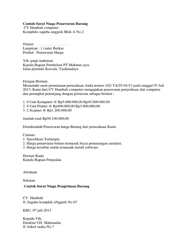 Contoh surat permintaan penawaran usaha mandiri jl. Contoh surat niaga permintaan barang. Contoh surat surat niaga adalah surat resmi yang isinya berupa tawaran jual beli yang berhubungan dengan barangjasa yang biasanya dipakai dalam perdagangan dan perniagaan.