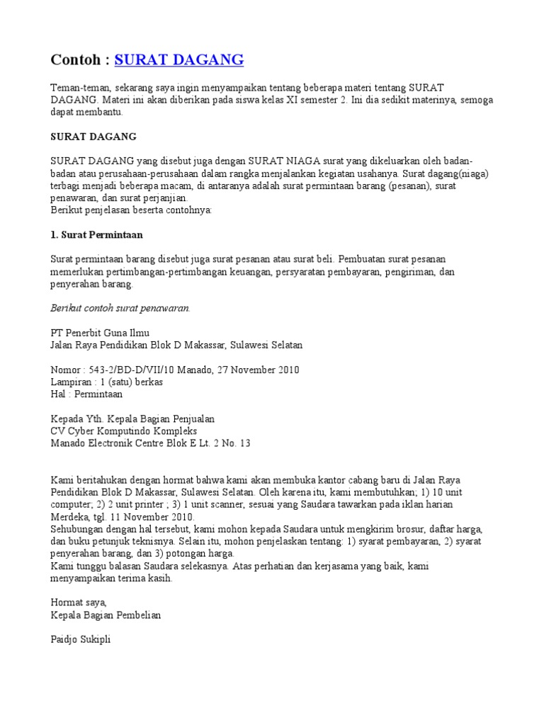 Contoh surat niaga demi terjadinya proses yang lancar dalam suatu perdagangan atau kerjasama tentunya diperlukan komunikasi yang serius antara pihak pihak yang melakukannya. Untuk mencapai hal ini harus ada suatu media komunikasi yang bisa menghubungkan kedua pihak secara efektif. Contoh surat niagadagang berbeda dengan surat jenis lainnya untuk berbisnis tujuan dan isi konten perlu diperhatikan.