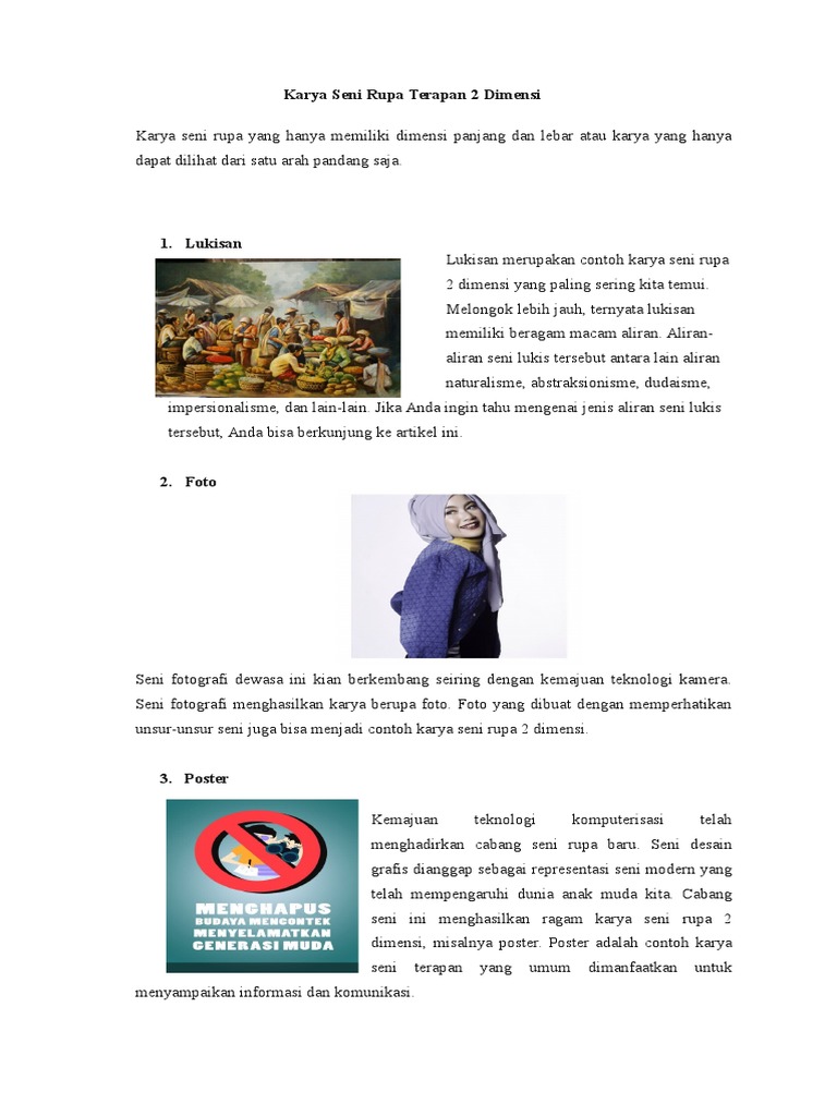 Contoh karya seni 2 dimensi. Contoh karya seni rupa 2 dimensi banyak sekali berikut ini diantaranya yang biasa kita lihat dalam kehidupan sehari hari. Perbedaan seni rupa 2 dimensi dan 3 dimensi kecuali perbedaan nya bila anda juga bisa mendapati contoh contoh dari ke dua seni rupa tersebut jika di bahas sebagai detail tentang pengertian seni rupa 2 dimensi teknik yang di gunakan pada seni rupa 2 dimensi dan juga contoh seni rupa 2 dimensi. Lukisan sumber gambar.