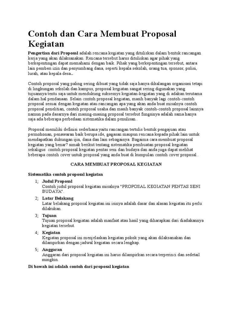 Namun kamu juga harus tetap memperhatikan alur atau tahapan dari pembuatan proposal kegiatan tersebut. Lalu bagaimana cara membuat proposal kegiatan yang menjual dan menarik perhatian. Proposal merupakan rencana kegiatan yang dibuat dalam bentuk rencana kerja yang akan dilaksanakan.