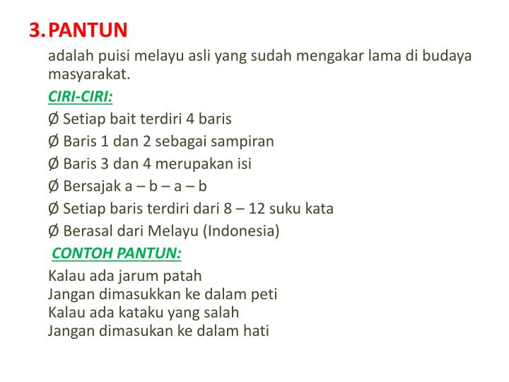 Contoh pantun menurut bahasa jawa kuno kata pantun berarti tuntun atuntun yang ketika diterjemahkan dalam bahasa indonesia berarti aturan. Pada awalnya pantun hanya diucapkan secara lisan. Misalnya dalam bahasa padang atau minangkabau pantun dikenal dengan patuntun dalam bahasa jawa dikenal dengan parikan dan dalam bahasa sunda dikenal dengan istilah paparikan.