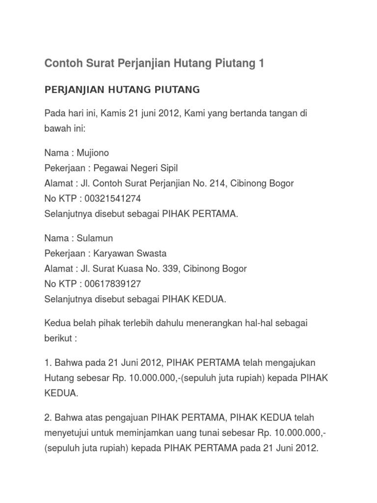 Contoh Surat Perjanjian Hutang Piutang Yang Tepat Lalod