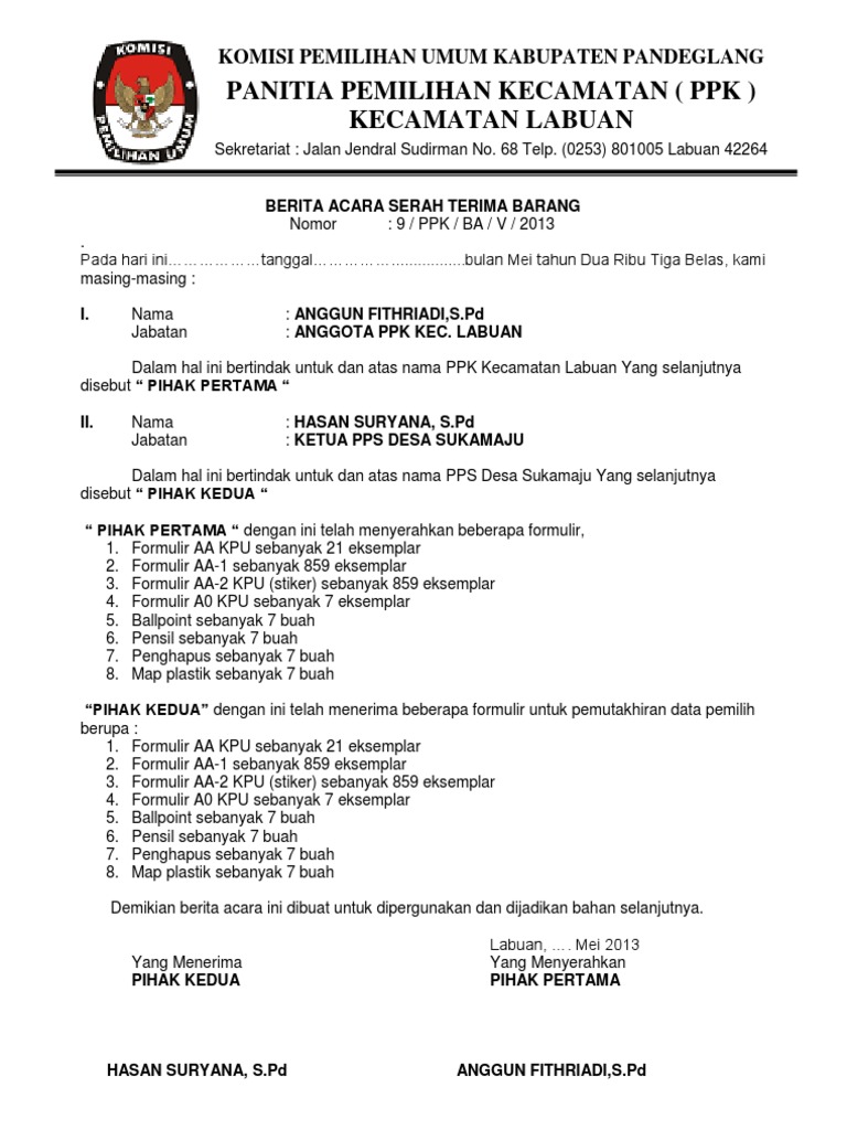 Contoh berita acara penyerahan barang. Bagi suatu permasalahan masalah baik berupa pelaksanaan perencanaan ataupun pengendalian kebijaksaan pimpinan. Surat ini sebaiknya segera dibubuhkan tanda tangan saat ada prosesi penyerahan suatu barang dari satu pihak ke pihak lain. Contoh berita acara serah terima barang jneco.
