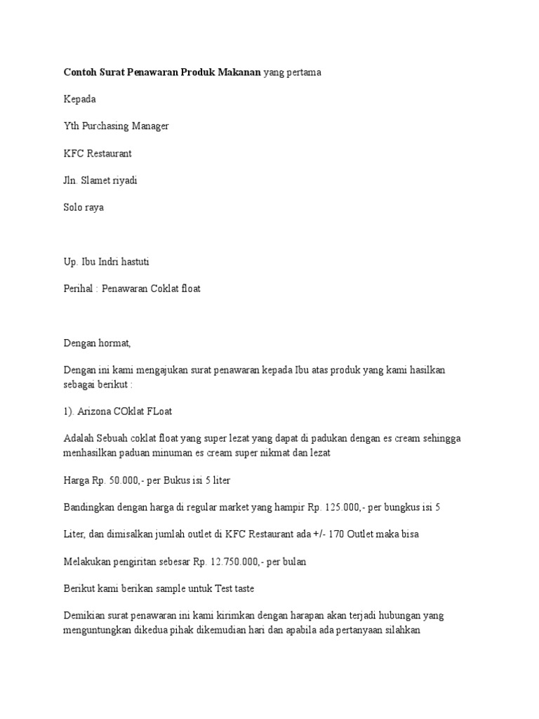 Contoh Surat Penawaran Produk Makanan Yang Pertama Docx