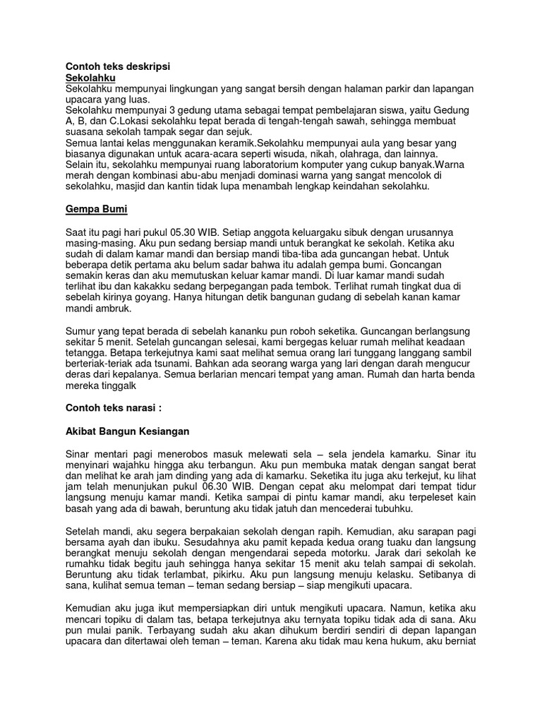 Nah disini kita coba membuat contoh teks deskripsi tentang berbagai hal umpama hewan sekolah rumah lainnya dlm bahasa inggris indonesia. 2 contoh teks deskripsi tentang ibu lengkap teks deskripsi merupakan wacana yang menjelaskan tentang penggambaran suatu obyek berkaitan dnegan kondisi bentuk fisik sifat karakter dan segala hal yang terdapat pada obyek tersebut. Penggambaran dalam teks deskripsi dilakukan oleh penulis yang didasarkan pada hasil kegiatan pengamatan.