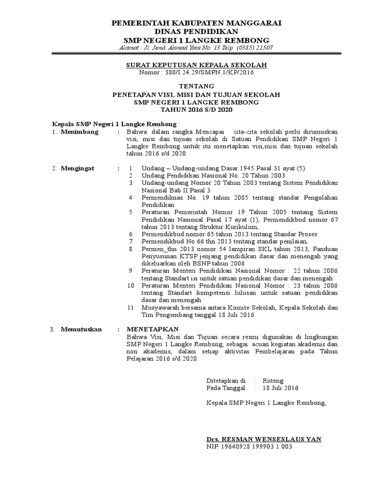 1 Contoh Sk Penetapan Visi Misi Dan Tujuan Sekolah Bentuk File Word Doc